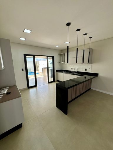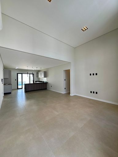 Sala e cozinha integradas com pé direito alto
